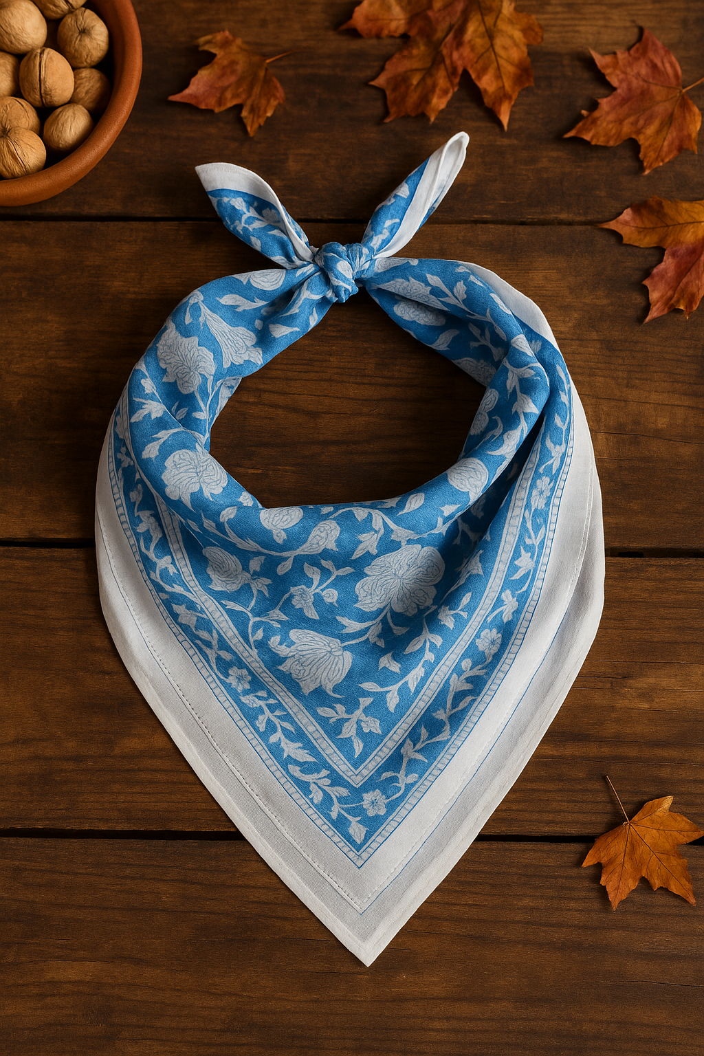 Chaque foulard est une pièce unique, imprimée avec soin à l’aide de tampons sculptés à la main et de teintures naturelles, ce qui lui confère son charme authentique et ses légères irrégularités caractéristiques du fait main.