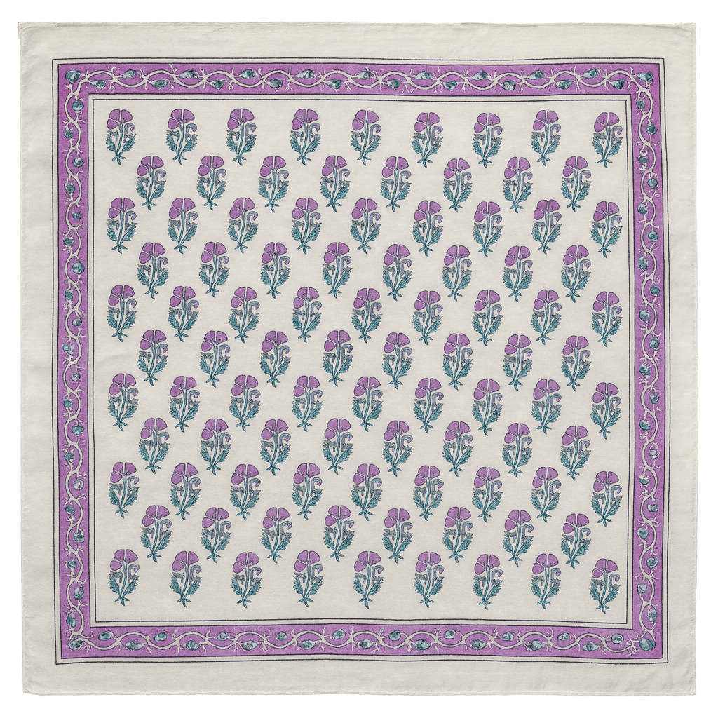 Apportez une touche d’élégance artisanale à votre style avec ce foulard carré en voile de coton, imprimé à la main selon la technique ancestrale du block print à Jaipur, en Inde. Léger, doux et polyvalent, il se porte aussi bien en bandana, tour de cou, dans les cheveux ou attaché à un sac.