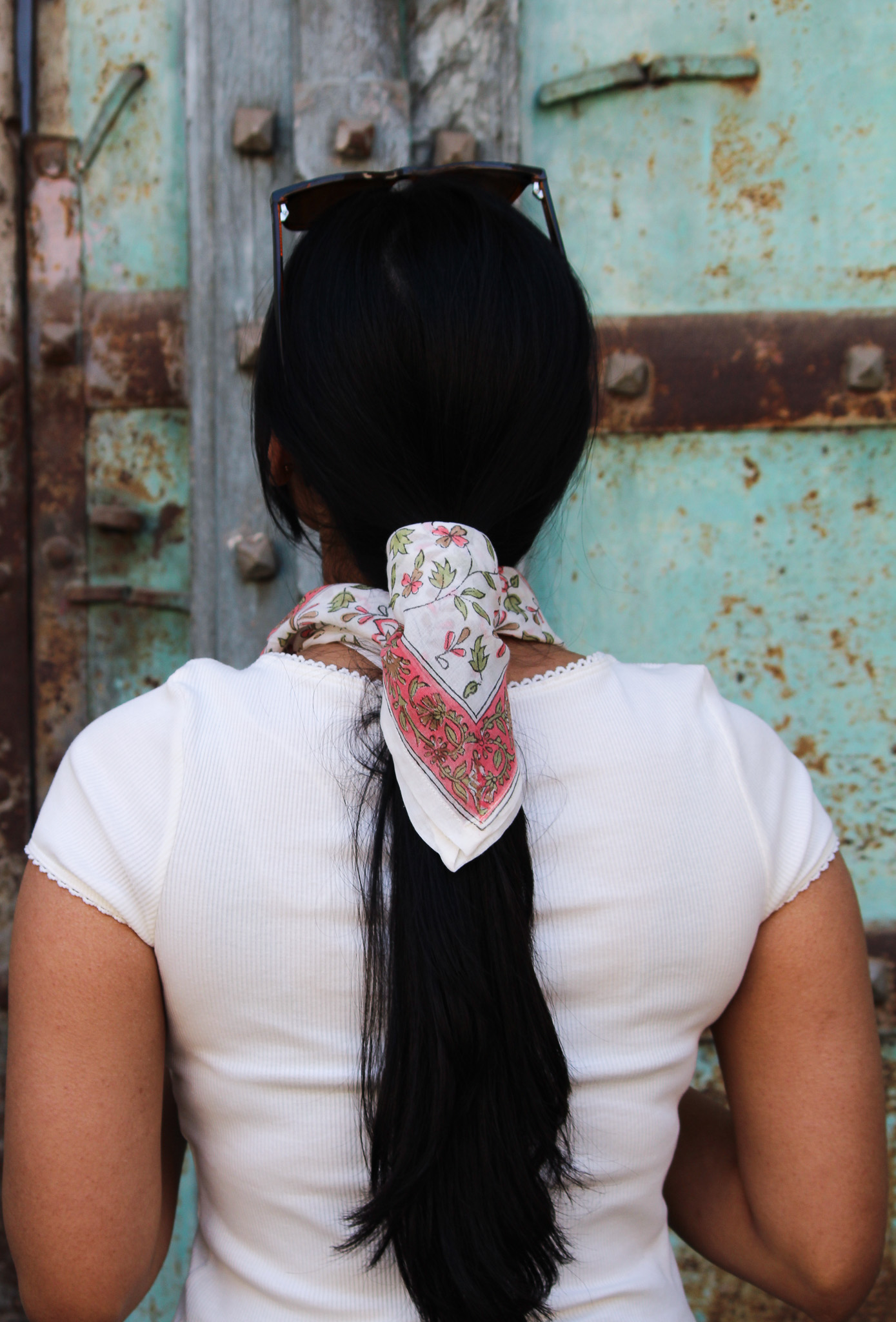 Apportez une touche d’élégance artisanale à votre style avec ce foulard carré en voile de coton, imprimé à la main selon la technique ancestrale du block print à Jaipur, en Inde. Léger, doux et polyvalent, il se porte aussi bien en bandana, tour de cou, dans les cheveux ou attaché à un sac.