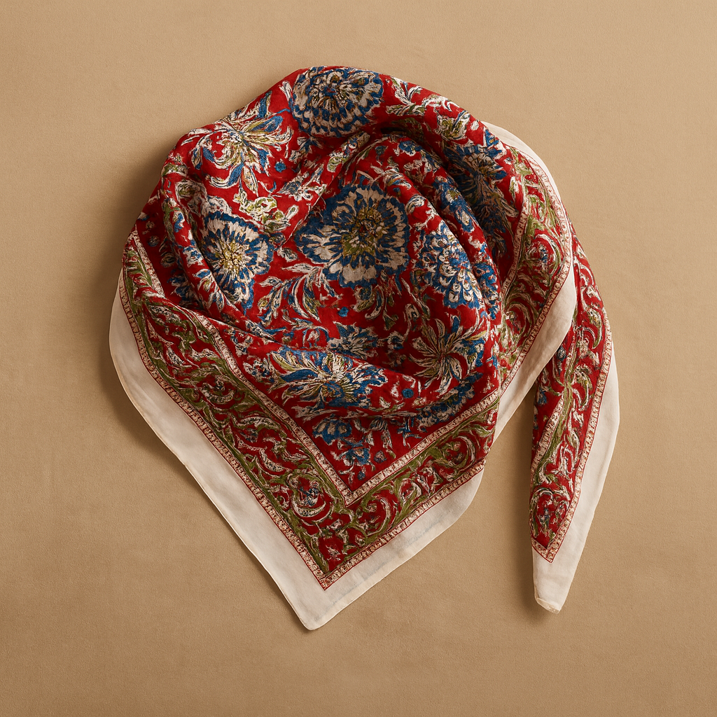 Chaque foulard est une pièce unique, imprimée avec soin à l’aide de tampons sculptés à la main et de teintures naturelles, ce qui lui confère son charme authentique et ses légères irrégularités caractéristiques du fait main.