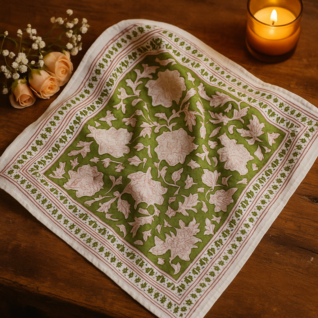 Chaque foulard est une pièce unique, imprimée avec soin à l’aide de tampons sculptés à la main et de teintures naturelles, ce qui lui confère son charme authentique et ses légères irrégularités caractéristiques du fait main.