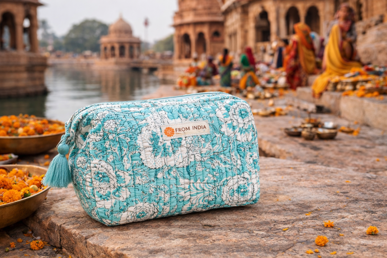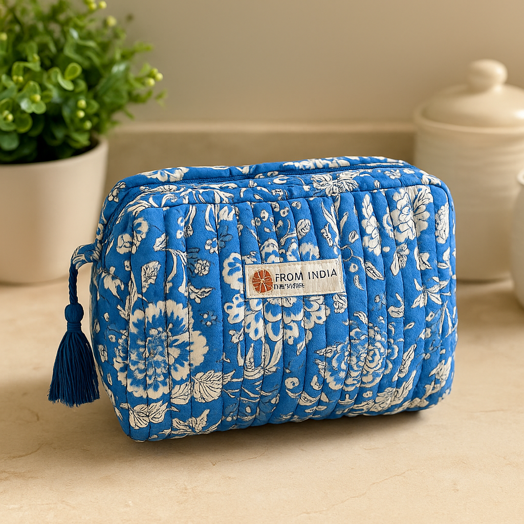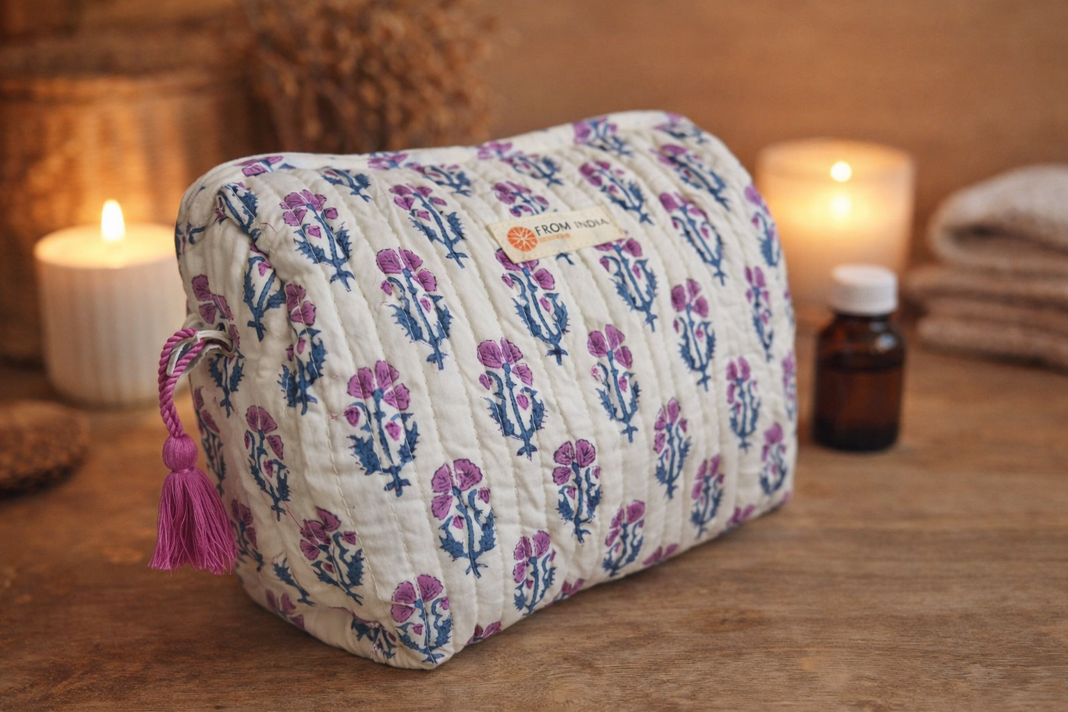 Apportez une touche artisanale et colorée à votre quotidien avec notre trousse de toilette en tissu coton blockprint, imprimée à la main selon une technique traditionnelle indienne. Compacte et élégante, elle est idéale pour vos produits de beauté, essentiels de voyage ou accessoires du quotidien.